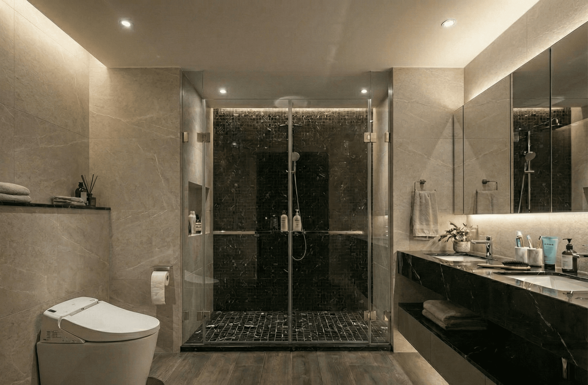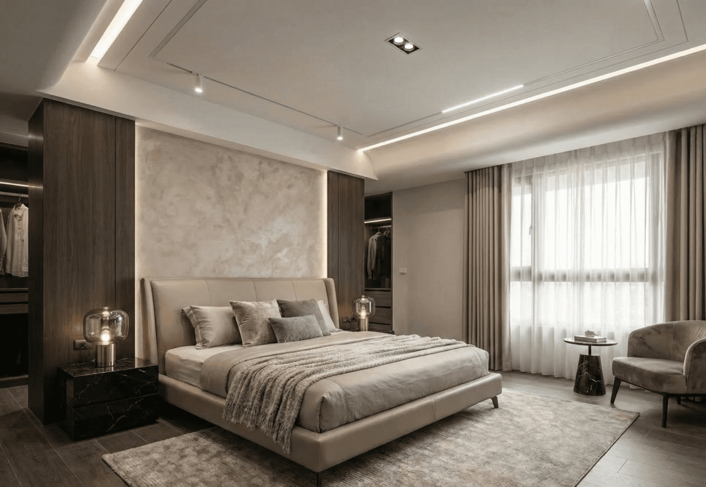 看似純淨的表面,細看卻蘊藏豐富層次。我們以Greige(灰與米)**為主色調,模擬大地礦物的原始色澤。靈感具象化於異材質的拼接上,透過天花板嵌入的流線燈光,如同精密的算式劃過天際,將科學的精準美學與居家生活完美融合,詮釋出專屬於鄭博士的現代紳士格調。