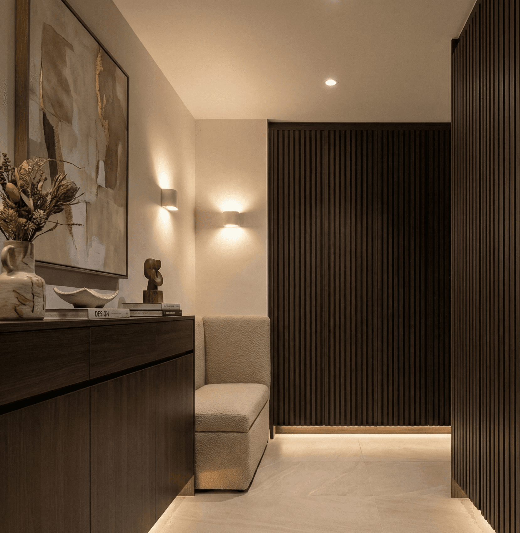 這個空間的靈感來自於一件頂級的訂製西裝。對於紳士而言,質感往往藏在細節裡,而非顯眼的商標。我們將空間視為布料,將光線視為縫線。深灰色的牆面如同精紡的深色羊毛面料,沈穩而有垂墜感;而金屬件與燈光則像是袖口的一枚精緻袖扣,畫龍點睛。